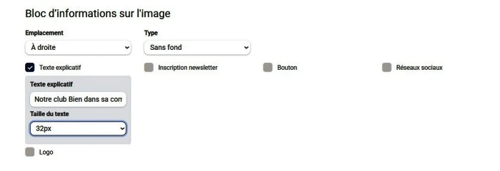 Le slogan (Bloc d’information sur l’image) vous pouvez mettre « bien dans sa ville bien dans sa vie » ou « bienvenue à mon club »